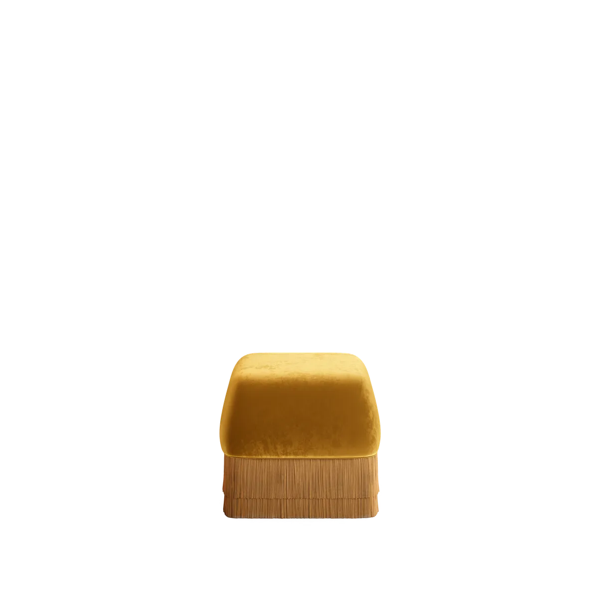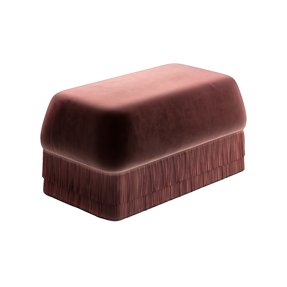 The Alcove Bench extends the collection’s tactile language in a compact, sculptural piece. Its velvet-clad body and fringed base create a delicate contrast between solidity and softness, a quiet accent that complements the larger seating pieces or stands gently on its own.