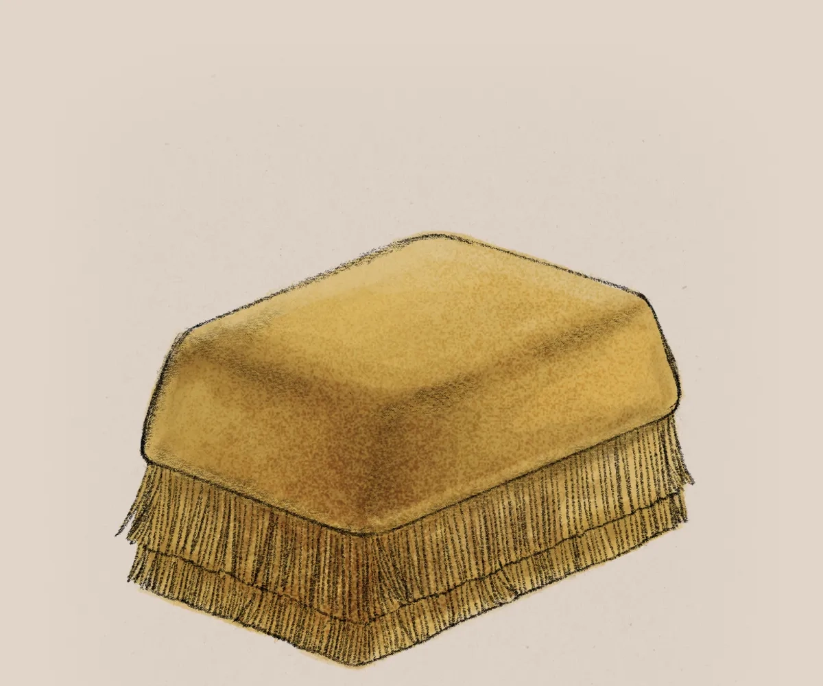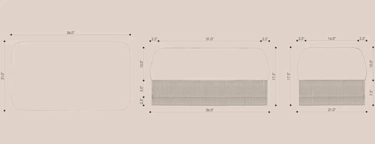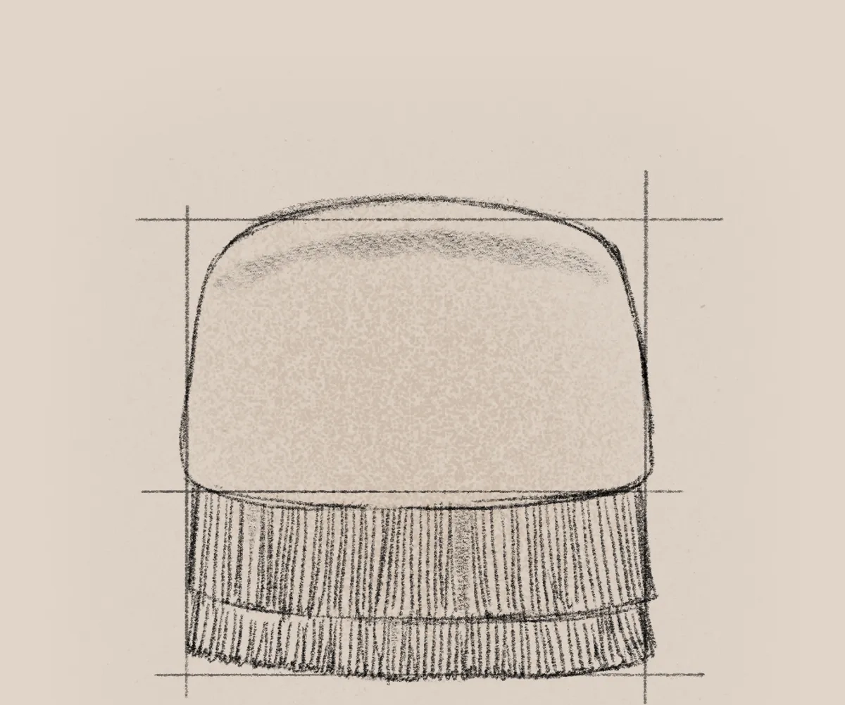The Alcove Bench extends the collection’s tactile language in a compact, sculptural piece. Its velvet-clad body and fringed base create a delicate contrast between solidity and softness, a quiet accent that complements the larger seating pieces or stands gently on its own.