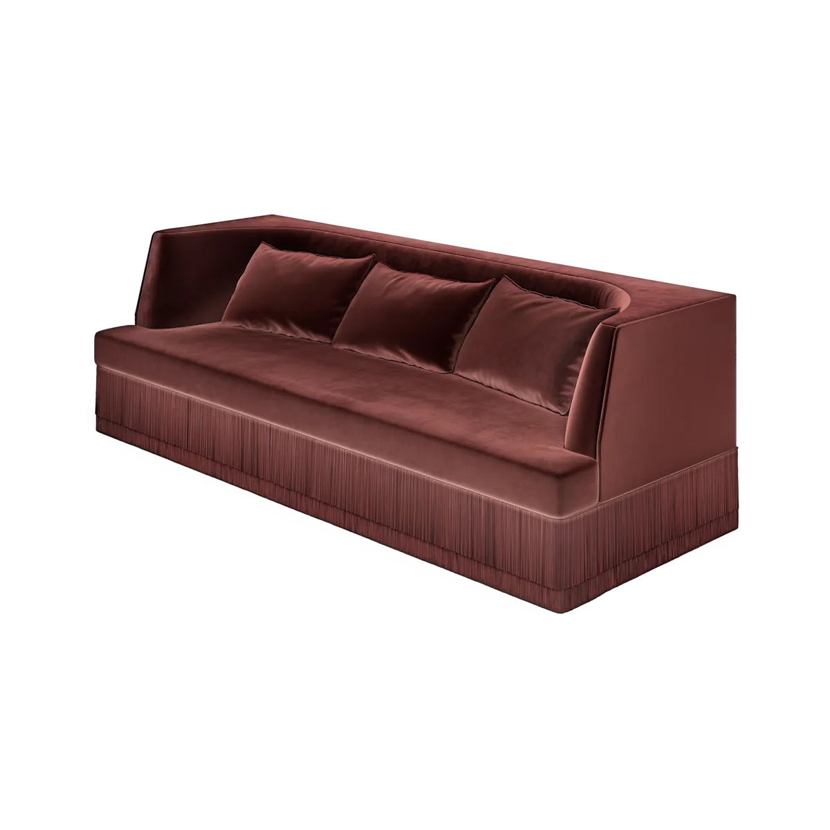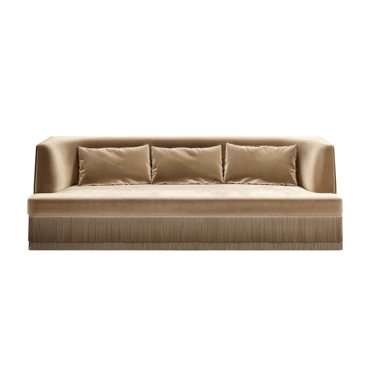 The Alcove Sofa carries the same sculptural poise and refined comfort as the armchair, now extended into generous proportions. With enveloping backrests and a discreet fringe skimming the floor, it invites pause and presence in shared or solitary spaces.