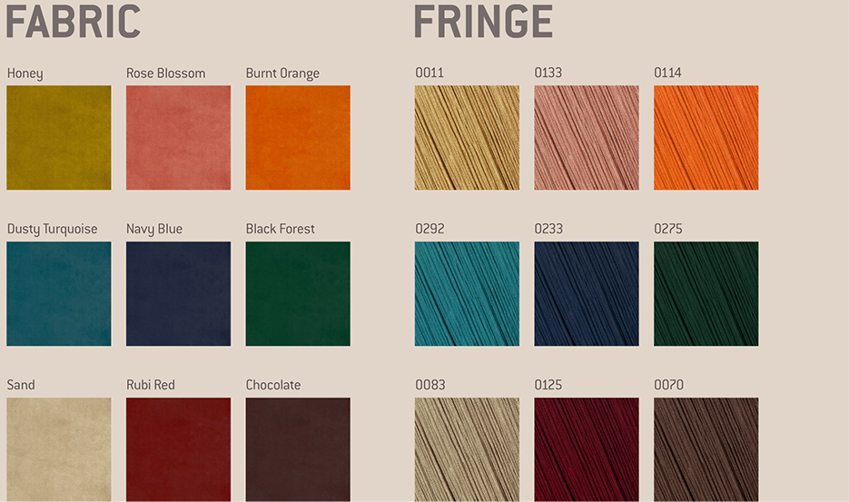 Fully upholstered in velvet with two layers of fringe trim detailing at the base.