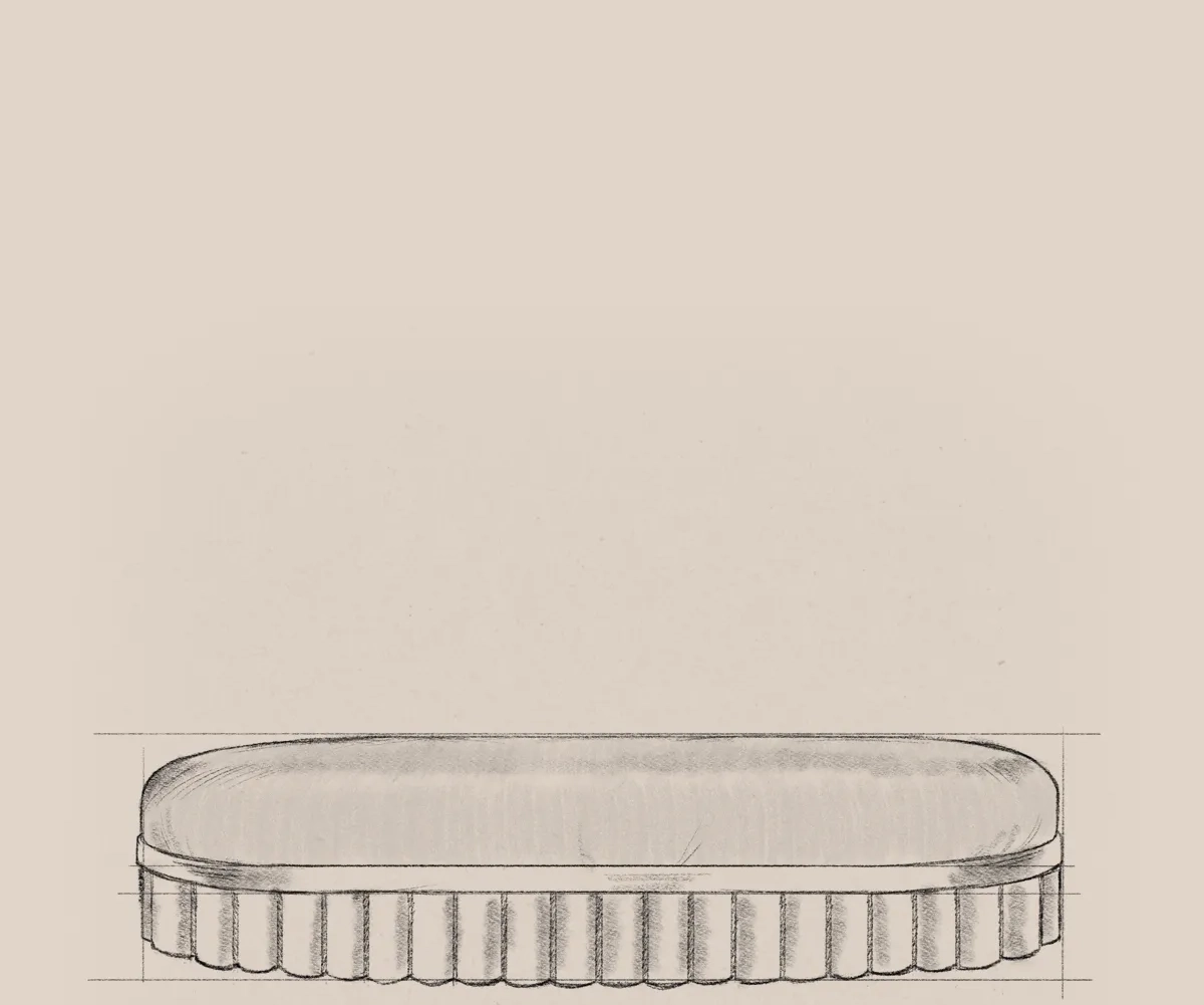 With its elongated silhouette and rounded edges, the Ripple Bench stretches softly across a space. The carved base, composed of repeated vertical elements, anchors the piece with a sense of quiet rhythm. Above, the upholstered cushion offers tactile contrast, a smooth landing atop sculptural foundation.