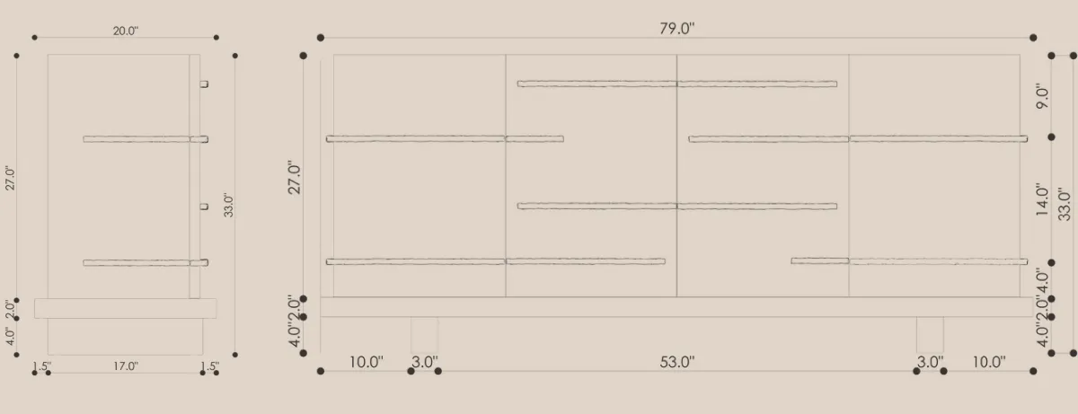 The Strata Sideboard translates tectonic memory into refined geometry. Horizontal brass inlays slice across its façade like mineral fractures, tracing silent events layered over time. Each drawer front is a surface of tension – warm against cool metal, stillness crossed by motion.